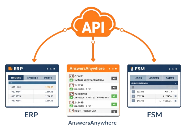 Structured fix and parts data is pushed from AnswersAnywhere into FSM and ERP systems via open APIs, eliminating manual entry and data duplication.
